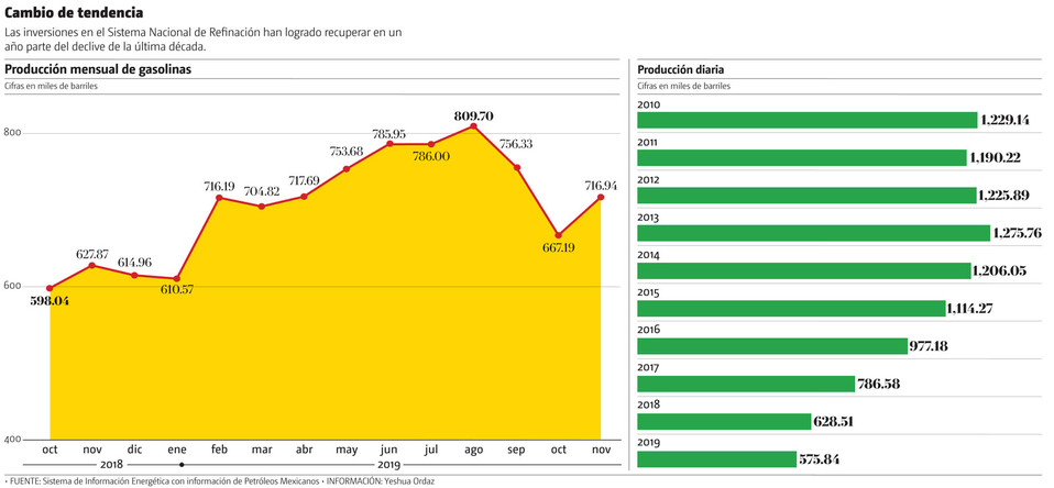 Casi un año después, en agosto de 2019 se procesaron 708 mil barriles diarios. Esta es la cifra más alta en este sexenio.