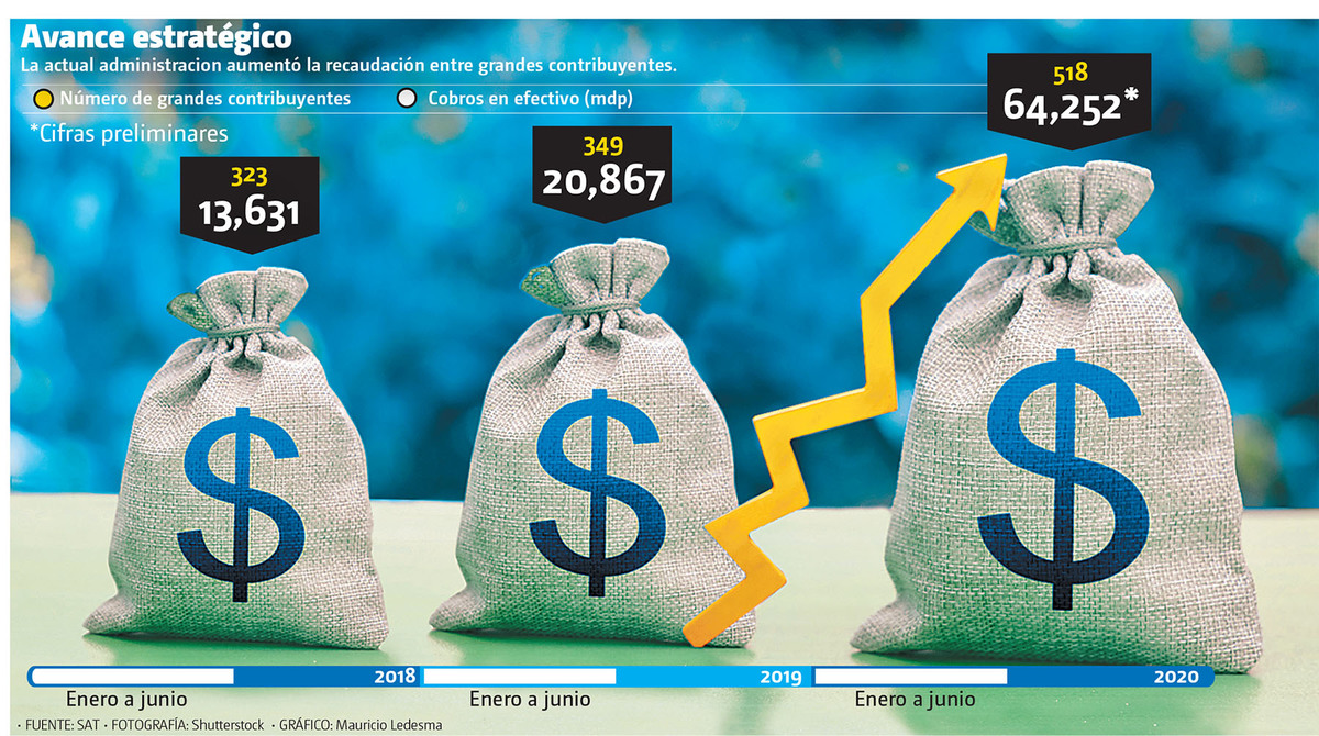 El Servicio de Administración Tributaria (SAT) informó que en el primer semestre de 2020 la Administración General de Grandes Contribuyentes logró una recaudación histórica de 64 mil 252 millones de pesos en efectivo, monto que superó tres veces lo logrado en el mismo periodo de 2019 y casi cinco veces lo de 2018.