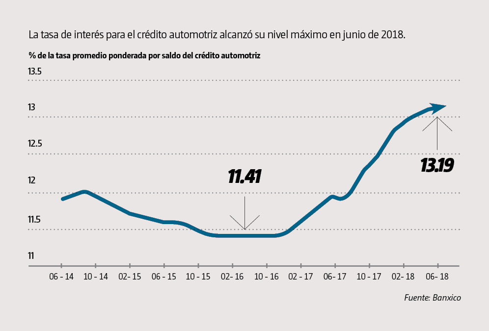 En junio de 2018, la tasa ponderada promedio del crédito automotriz se ubicó en 13.19%, el nivel más alto desde que existen cifras disponibles en Banxico abril de 2011.
