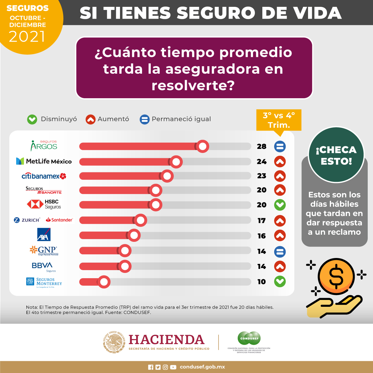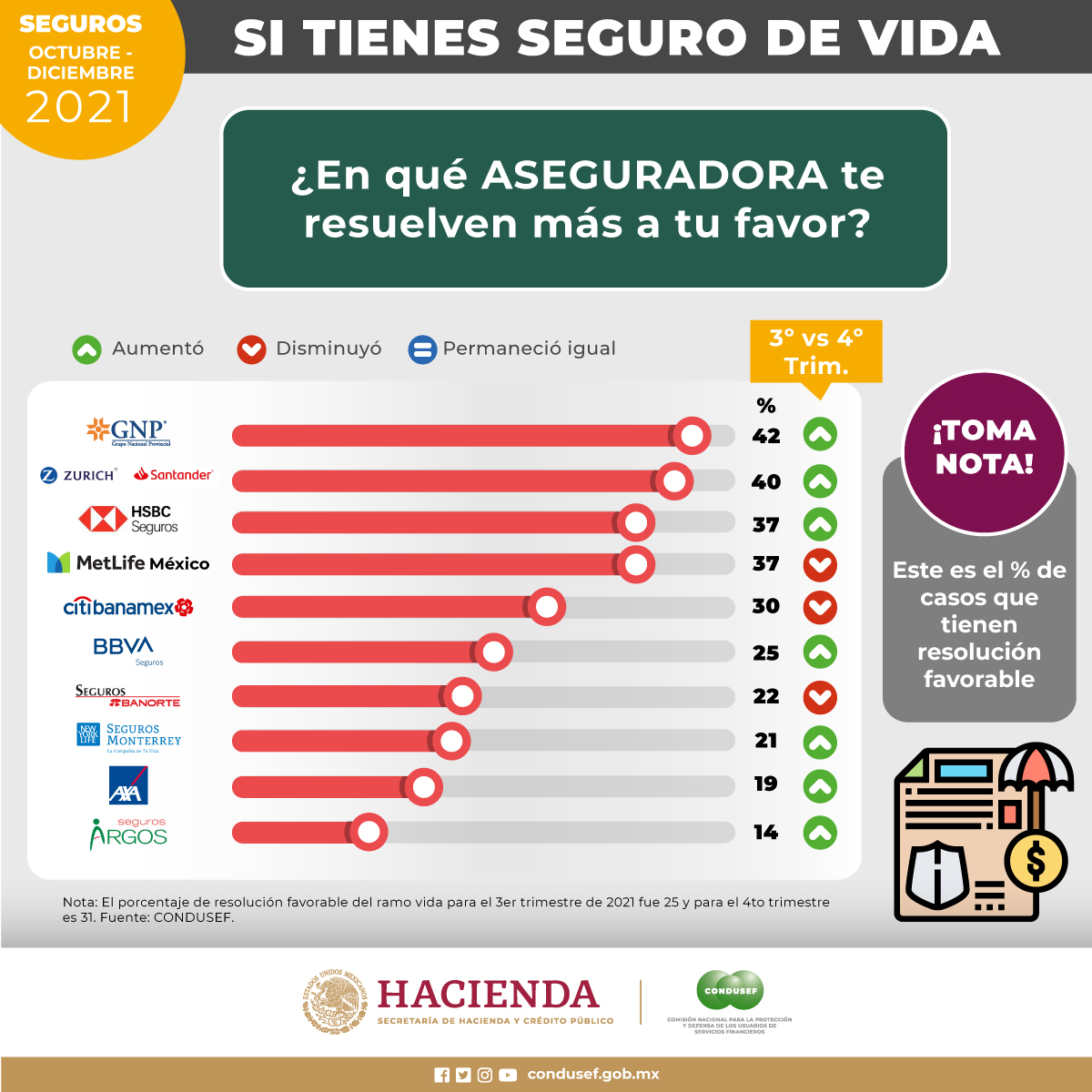 Respecto del tercer trimestre, MetLife México, Citibanamex Seguros y Seguros Banorte disminuyeron su resolución favorable en el cuarto trimestre.