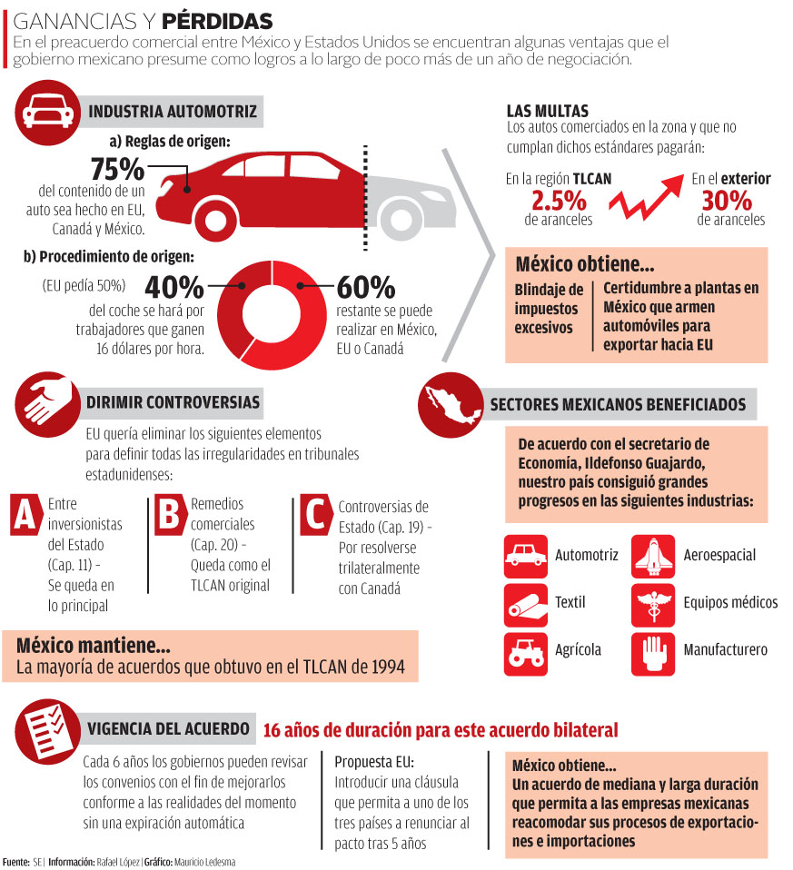 En el acuerdo preliminar entre EU y México las reglas de origen se modificaron para que 75 por ciento del valor agregado de los automóviles sea de contenido regional como mínimo, por encima de 62.5 por ciento. Aunado a ello se agregó que entre 40 y 45 por ciento del valor agregado de los vehículos esté fabricado por una mano de obra que gane por lo menos 16 dólares por hora.