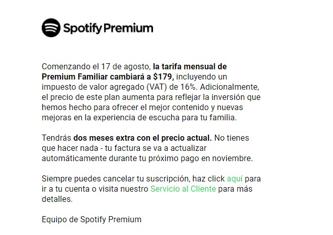 Spotify México anunció que incrementará el costo de sus planes en México a partir de hoy, 17 de agosto, debido a que se cobrará el Impuesto al Valor Agregado (IVA) del 16 por ciento, así lo informó sus usuarios a través de un correo electrónico donde detalla cuál será el nuevo precio para el plan al que están suscritos.