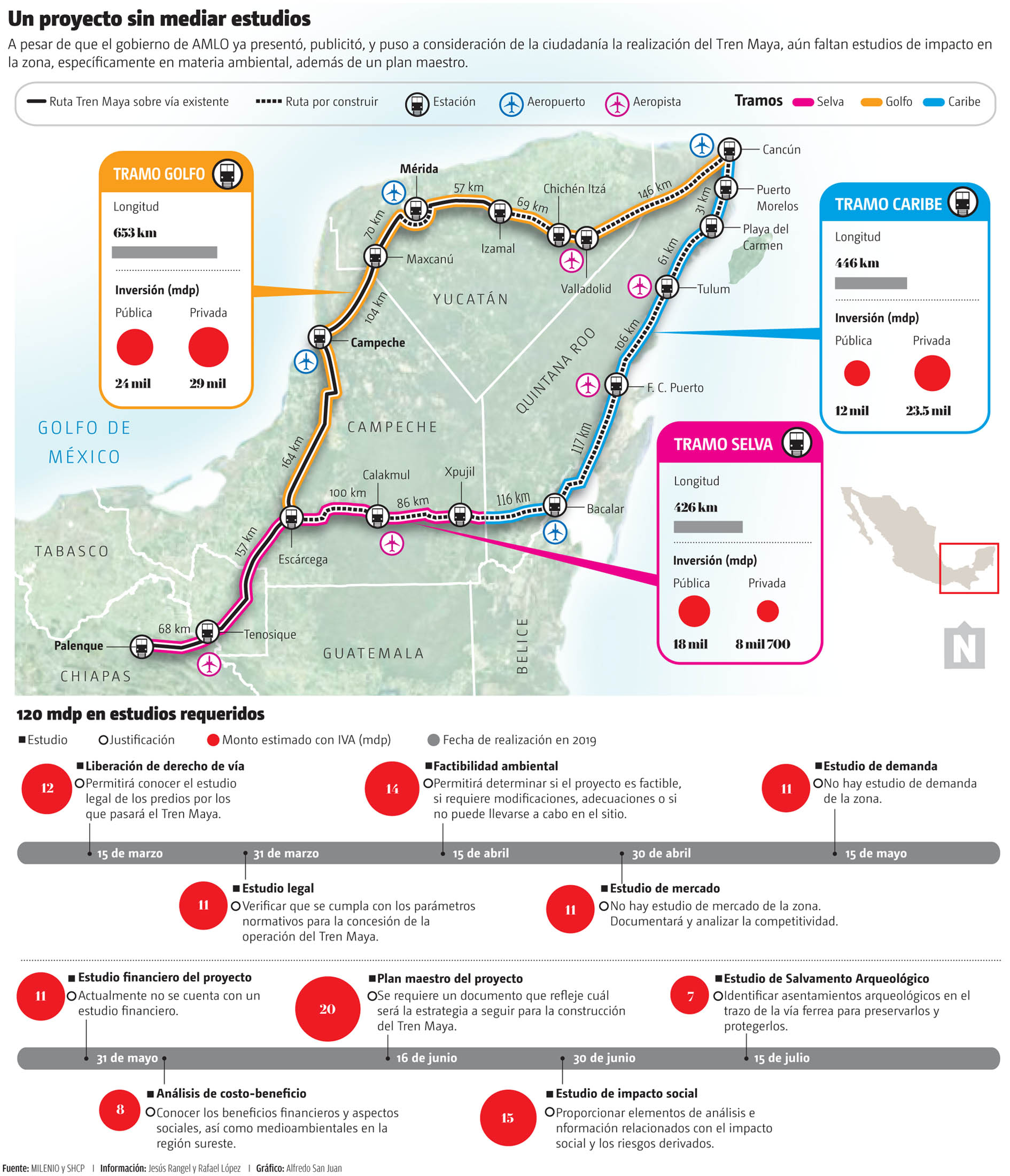 Los estudios son para determinar, entre otras cosas, los derechos de vía y potenciales áreas de expropiación ejidal; propuestas legales de contrato o títulos de concesión; posibles tarifas, velocidad y transporte de personas y carga; esquema financiero e inversiones sin "necesidad de que la Federación financie obras"; riesgos sociales y conflictividad, además de consultas a la población indígena y "mesas de diálogo para obtener la licencia social".