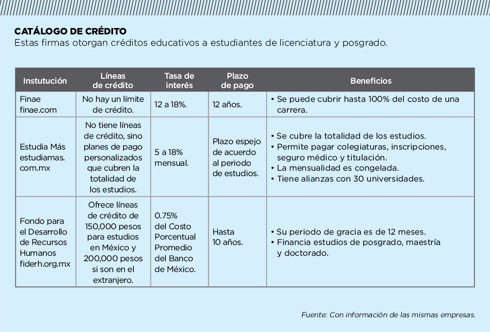En el caso de la financiera Estudia Más “hay un plazo espejo, es decir, si el programa de estudios dura tres años, el plan de pagos del préstamo se extiende tres más”, señala Fernanda Compean, encargada de mercadotecnia de la institución.