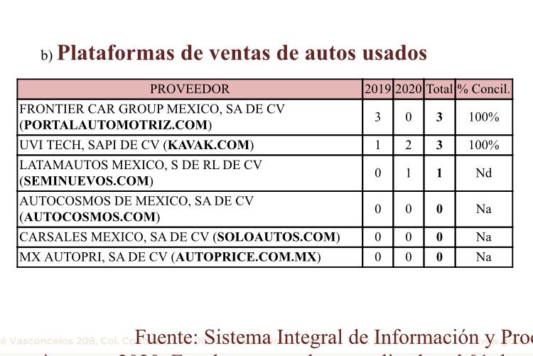 Por último las empresas: Autocosmos de México (autocosmos.com); Carsales de México (soloautos.com) y Mx Autopri (autoprice.com.mx), durante 2019 y lo que va de 2020, no han tenido registro de quejas por parte de consumidores.