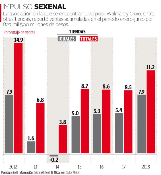 La asociación a la cual pertenecen Liverpool, Walmart y Oxxo, entre otras tiendas, reportó ventas acumuladas entre enero y junio por 827 mil 500 millones de pesos.