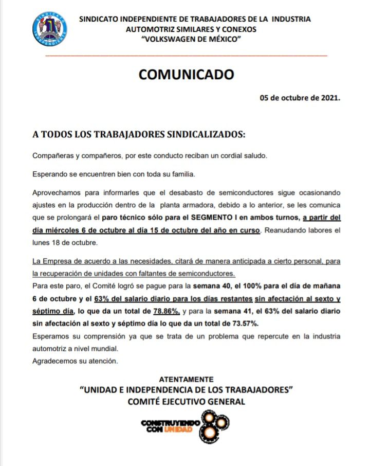Para este paro, el comité logró que se pague para la semana 40, el 100 por ciento para este miércoles 6 de octubre y el 63 por ciento del salario diario para los días restantes sin afectación al sexto y séptimo día, lo que da un total del 76 por ciento y para la semana 41, el 63 por ciento del salario diario sin afectación al sexto y séptimo día lo que da un total del 73.57 por ciento. Por último, cabe resaltar que esta problemática está repercutiendo en la industria automotriz a nivel mundial.