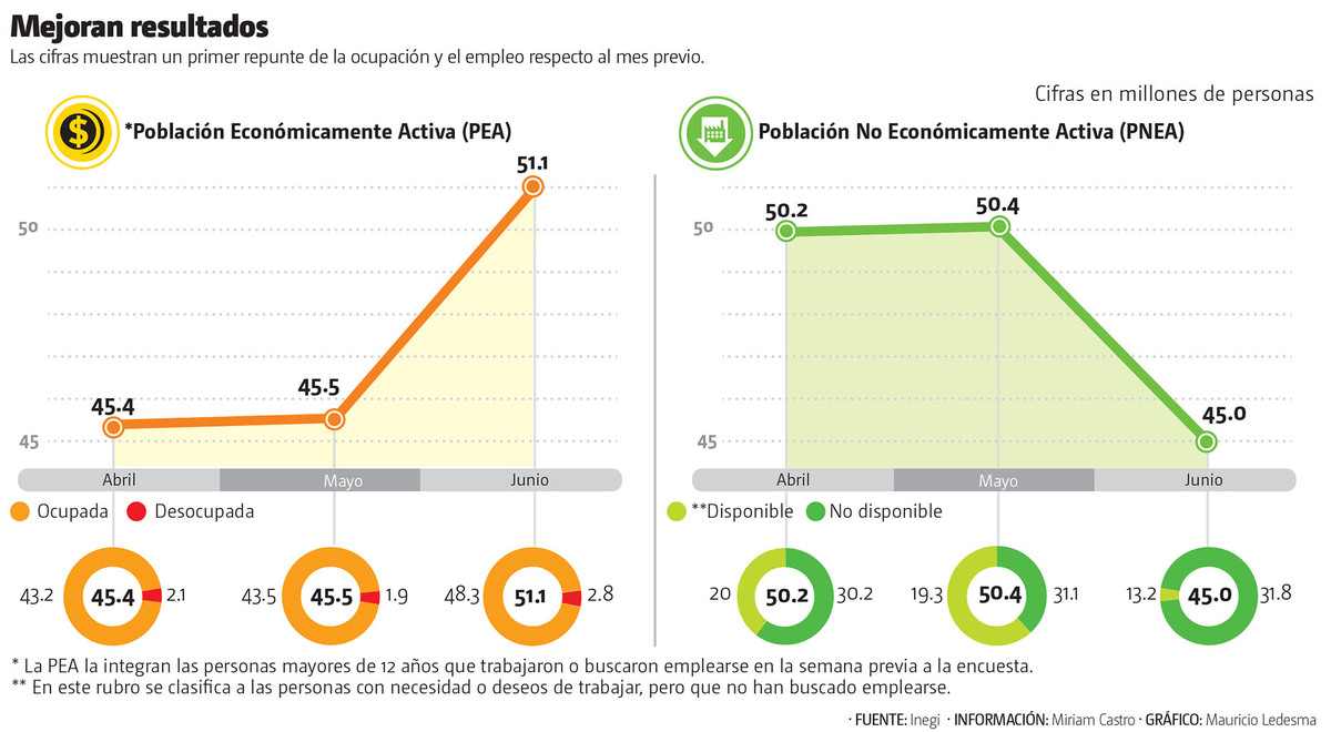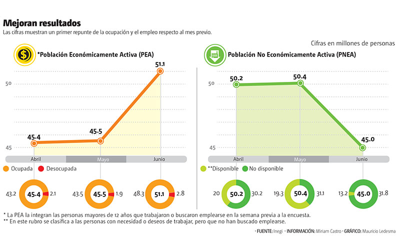 Ante el reinicio de la actividad económica, el empleo comenzó a recuperarse en junio con el regreso al mercado laboral de 5.7 millones de personas económicamente activas; de ellas, 4.8 millones son personas ocupadas y 901 mil en condición de desocupación, informó el Instituto Nacional de Estadística y Geografía (Inegi).