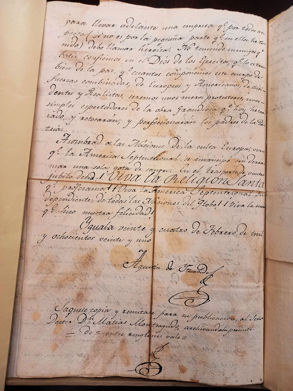 Al final del texto del Plan de Iguala aparece la firma autógrafa del Libertador de México. De su puño y letra,ordenó: