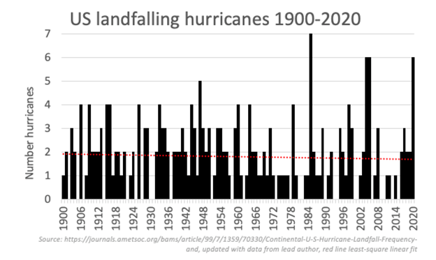 Muchos de los mejores datos proceden de Estados Unidos. Y a pesar de lo que se oye una y otra vez, los huracanes del Atlántico no son cada vez más frecuentes. De hecho, la frecuencia de los huracanes que tocan tierra en el territorio continental de Estados Unidos ha disminuido ligeramente desde 1900.