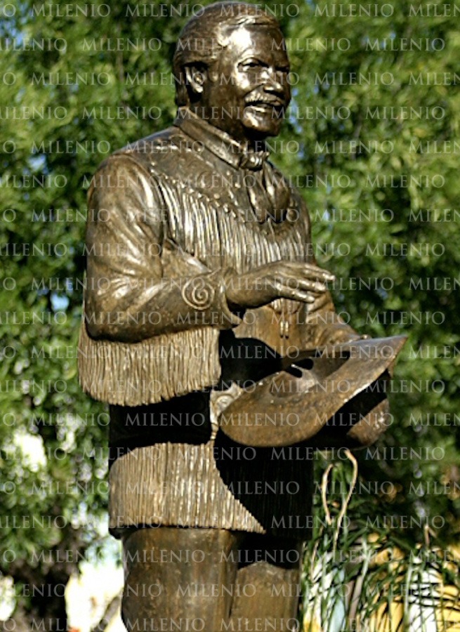 Por cierto, que era la imagen original, ahora deformada, de la escultura que hay de él escondidona en el Parque Hundido de la Macroplaza de Monterrey. Pues le robaron la placa que decía la frase, el sombrero y una mano. Para ahorrarse una lana le pidieron al escultor Cuauhtémoc Zamudio que le hiciera la pura mano. Eliminando así la placa, el sombrero, la idea y si hubieran podido, hasta los aplausos.