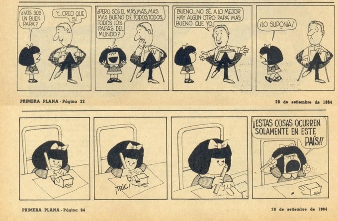 La muerte de Joaquín Salvador Lavado a los 88 años de edad ha producido el muy feliz paseo por su legado en todo el planeta... en los más de 30 idiomas a que fue traducida Mafalda, su obra principal. Tan permanente, como la abrazada escultura, verde y pequeña... sentada sobre la banca en la bella placita central del barrio de San Telmo, en Buenos Aires. Más visitada y acariciada que las del general libertador José de San Martin, hasta hace algún tiempo, el principal héroe nacional de Argentina. Simboliza algo... simboliza mucho... simboliza todo. Por lo menos algo, mucho o todo de lo que tiene sentido.