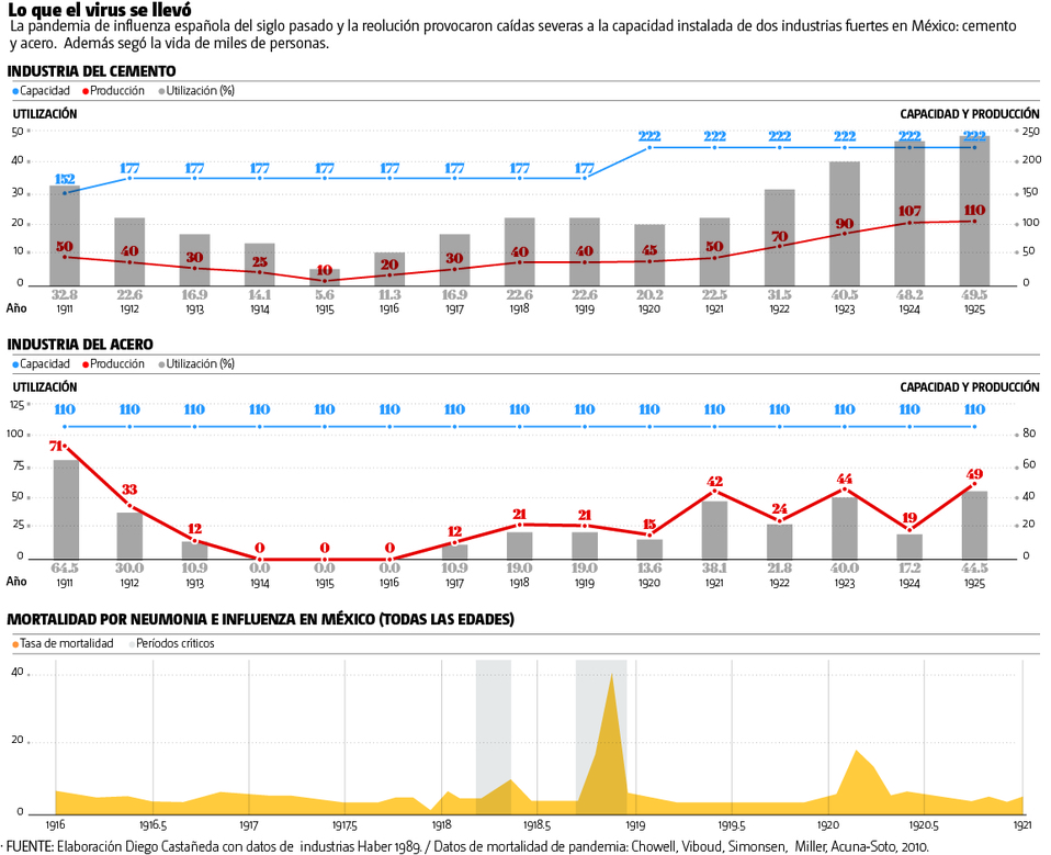 Es en este aspecto, el del crecimiento, que la recesión del coronavirus tiene reminiscencias con nuestra historia de hace un siglo. La contracción que se anticipa se aproxima en tamaño a las vistas en la Gran Depresión y en los años más intensos de la Revolución Mexicana. Caídas a doble dígito, 14 por ciento en 1932, 10 por ciento en 1914. Existe una similitud adicional con los tiempos de la revolución y de la gripe española, la producción de sectores completos también se detuvo, no se destruyó pero permaneció ociosa. De 1911 a 1915 la capacidad de producción de la industria acerera y cementera cayó en 82 por ciento luego se recuperó gradualmente hasta 1920 donde cayó otro 13 por ciento. La caída en la utilización es lo más parecido al cierre total de industrias que vemos hoy en día.