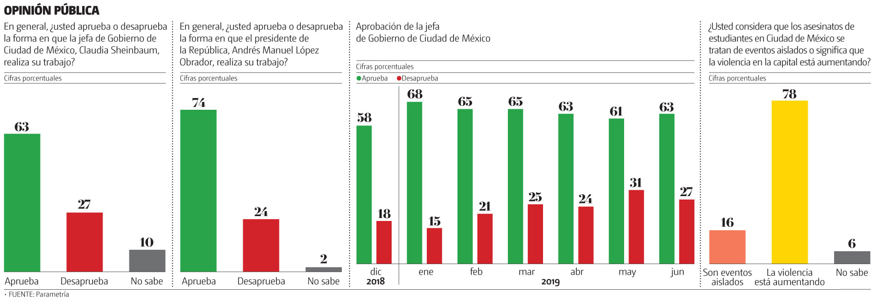 Nota metodológica: Encuesta Parametría. Representatividad: Ciudad de México. Número de entrevistas: 400 encuestas realizadas cara a cara del 29 de junio al 4 de julio de 2019. Nivel de confianza estadística: 95%. Margen de error: (+/-) 3.5%. Diseño, muestreo, operativo de campo y análisis: Parametría SA de CV. Método de muestreo: Aleatorio sistemático con probabilidad proporcional al tamaño. Unidad de muestreo: Las secciones electorales reportadas por el INE. Población objetivo: Personas de 18 años en adelante con credencial para votar que al momento de la entrevista residan en el lugar de interés.