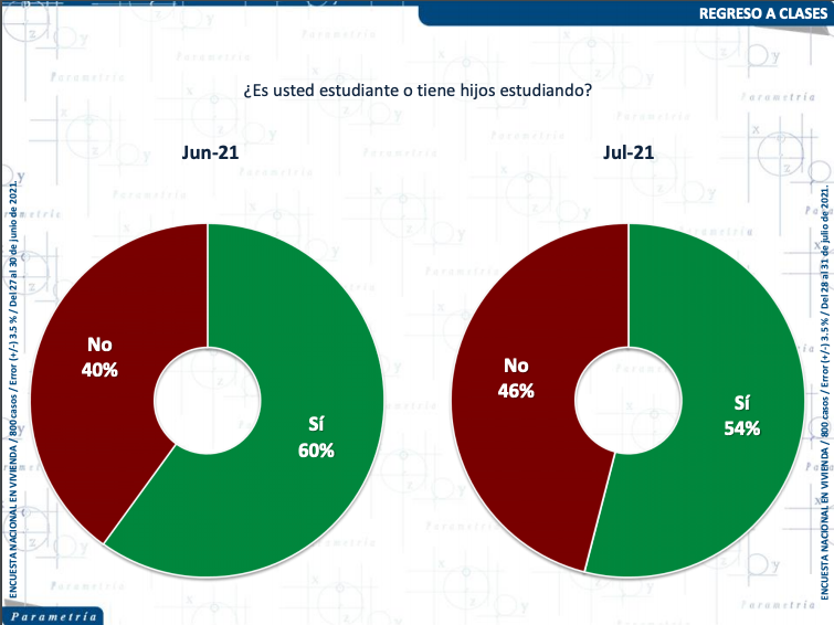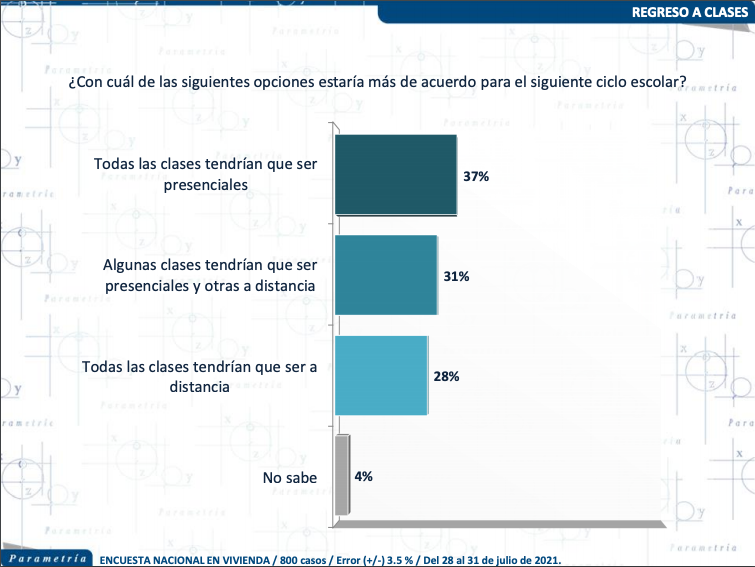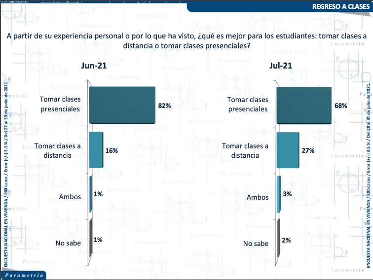 En México hay un consenso por el regreso a las aulas. Sin embargo, comparado con el mes anterior se observa una caída en la preferencia por las clases presenciales. Mientras en el mes de junio se observaba una preferencia de más de cada 8 entrevistados (82 por ciento), en julio este porcentaje baja 14 puntos porcentuales (68 por ciento).