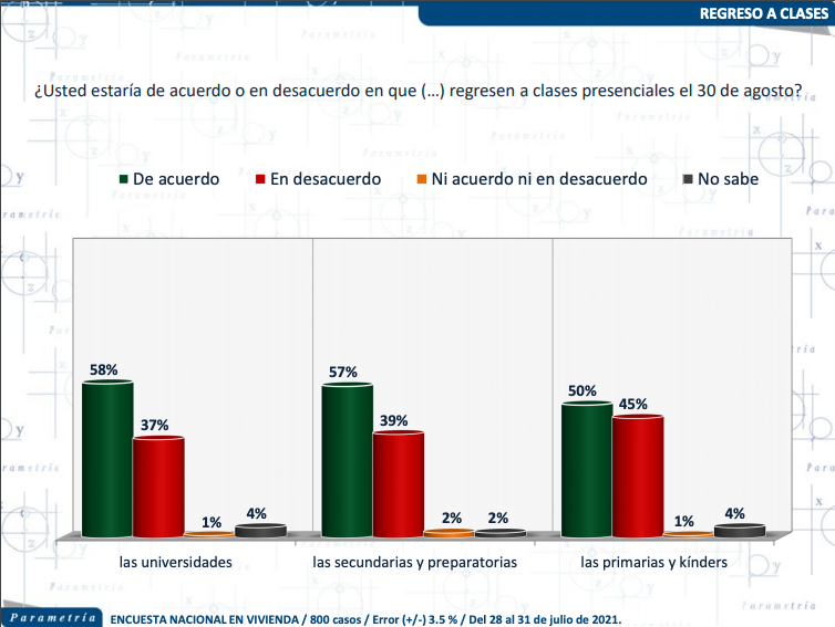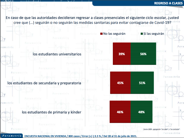 También se considera que el mayor nivel de cumplimiento de las normas de sanidad se dará entre los estudiantes de mayor escolaridad, los universitarios; luego vendrían los estudiantes de bachillerato y secundaria, y finalmente los de primaria y kínder. Es decir no se confía del todo que en el nivel educativo los infantes vayan a cumplir con todos los protocolos necesarios.