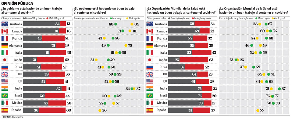 Hay pocas mediciones que estén registrando estos cambios con la frecuencia y la precisión que se requiere. La empresa francesa Ipsos es una de las pocas consultorías junto con Gallup que están haciendo este trabajo a nivel global. En su última entrega del 4 de mayo Ipsos Internacional reporta los resultados para 26 países, 26 mil entrevistas de su panel on line. Es pertinente decir que son muestras representativas para países desarrollados con acceso a tecnología de manera generalizada. No son representativas para países emergentes como Rusia, India Brasil y México.