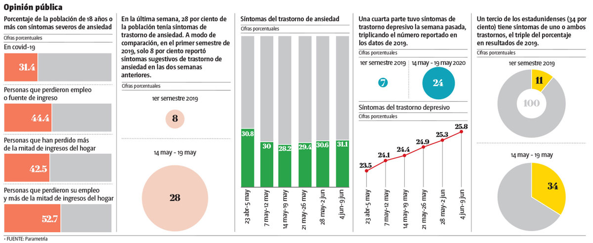 En Estados Unidos el dato comparado se refiere a su histórico. El comparativo es respecto a la gente que reporta depresión o ansiedad en el mismo periodo de años anteriores y qué porcentaje lo hace ahora. Para cada uno de los indicadores los niveles se triplican respecto al año anterior. Los síntomas de ansiedad en el promedio de la población representan 28 por ciento y los de depresión 24 por ciento. En el caso de que se reporten uno o ambos trastornos llega a poco más de una tercera parte de la población —34 por ciento—.