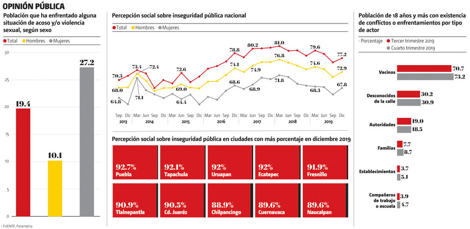 Nota metodológica: La Encuesta Nacional de Seguridad Pública Urbana (ENSU) se lleva a cabo en la primera quincena de los meses de marzo, junio, septiembre y diciembre de cada año. A partir de 2016 cuenta con una muestra de 300 viviendas trimestrales por ciudad de interés y a partir de septiembre de 2019, 300 viviendas por cada una de las 16 demarcaciones territoriales en que se divide la Ciudad de México. El agrupado nacional en diciembre de 2019 fue de 25 500 viviendas. El entrevistado, que debe contar con al menos 18 años de edad, es seleccionado aleatoriamente. El esquema de muestreo es probabilístico, trietápico, estratificado y por conglomerados, tiene como última unidad de selección la vivienda particular y como unidad de observación a la persona.