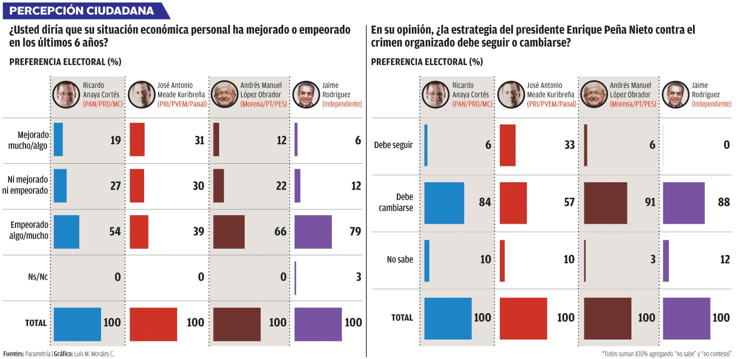 Entre los votantes de Anaya el 54 por ciento dijo que su economía personal se ha visto mermada en los últimos seis años, al igual que 66 por ciento que otorgó su voto a AMLO.