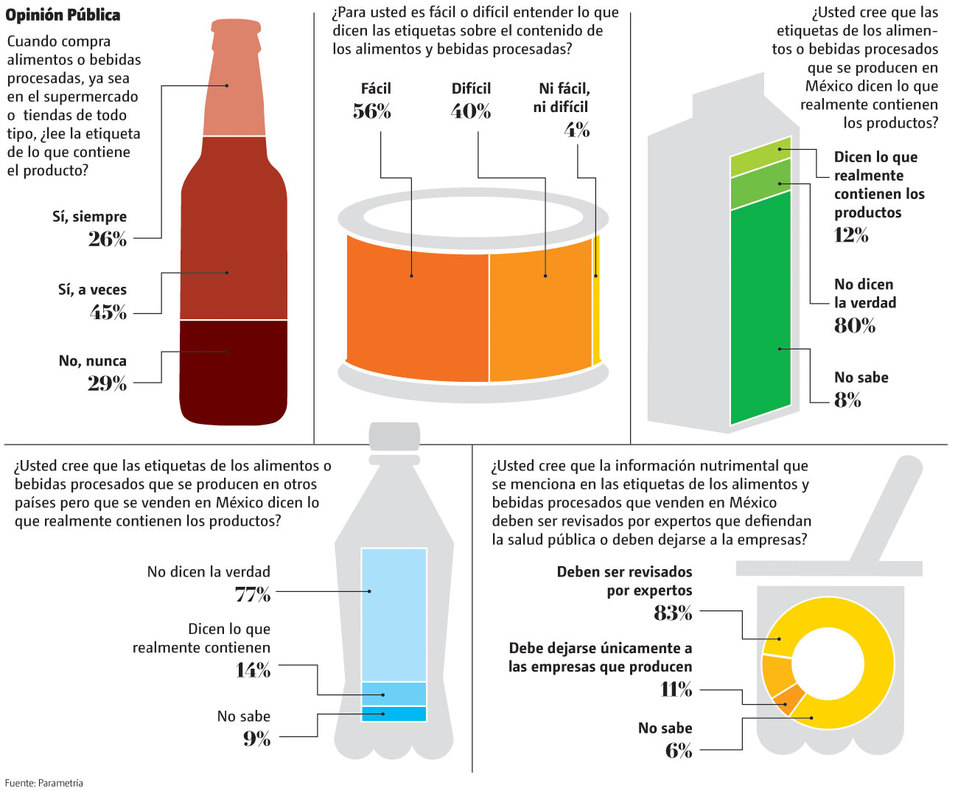 Uno de los datos más relevantes de este estudio es la poca credibilidad que tiene el etiquetado de los productos que se venden en México, ya sea elaborados dentro o fuera del país. Para 80 por ciento de los mexicanos las etiquetas en los alimentos y bebidas procesadas en México no contienen la información completa o no es la correcta, mientras que 12 por ciento de los encuestados considera que los etiquetados son correctos. En el caso de los alimentos que no son procesados ni enlatados en el país, 77 por ciento piensa que las etiquetas mienten con la información contenida, y solo 14 por ciento piensa que es correcta la información del etiquetado.