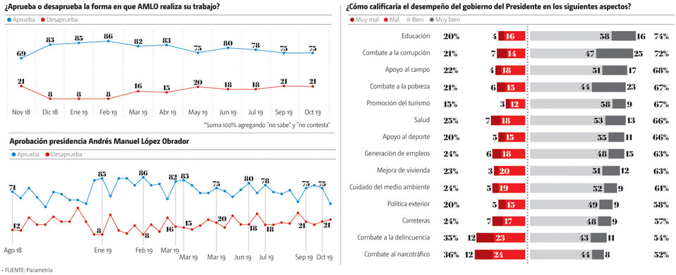 Nota metodológica: Encuesta cara a cara en vivienda. Representatividad: nacional. Número de entrevistas: 880 encuestas. Fecha de levantamiento: del 26 de octubre al 2 de noviembre de 2019. Nivel de confianza estadística: 95%. Margen de error: (+/-) 3.3%. Diseño, muestreo, operativo de campo y análisis: Parametría SA de CV. Método de muestreo: aleatorio sistemático con probabilidad proporcional al tamaño. Unidad de muestreo: las secciones electorales reportadas por el INE. Población objetivo: personas de 18 años en adelante con credencial para votar que al momento de la entrevista residan en el lugar de interés.