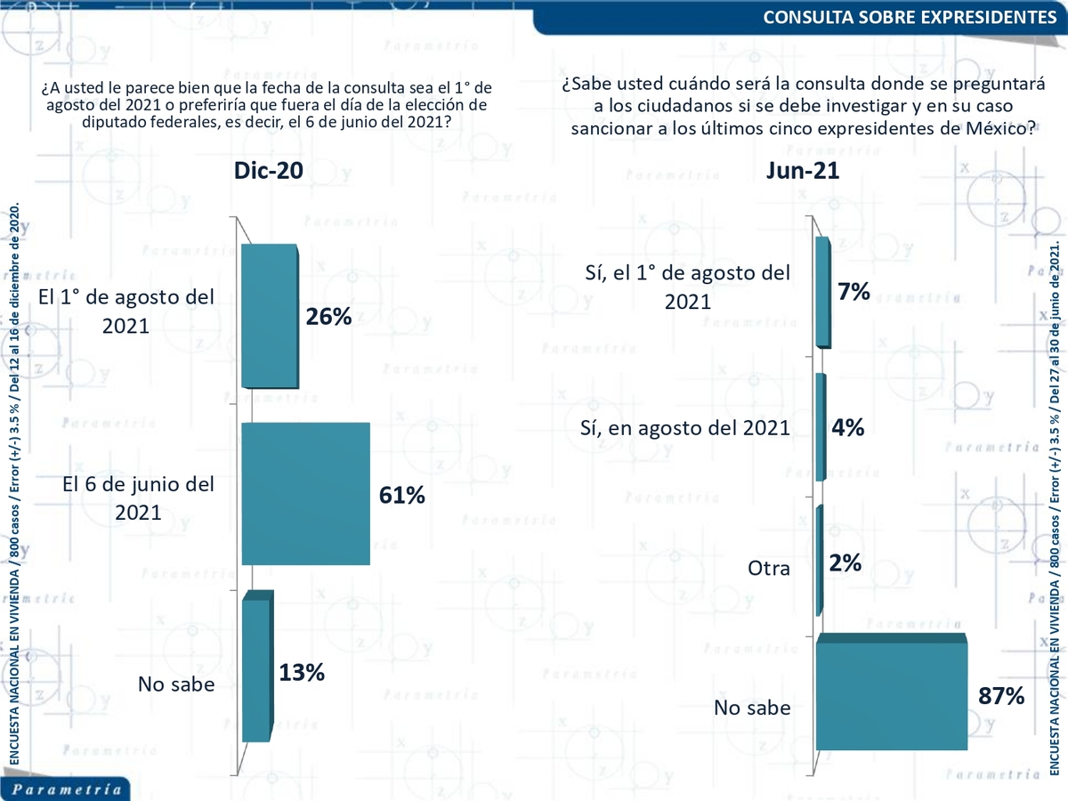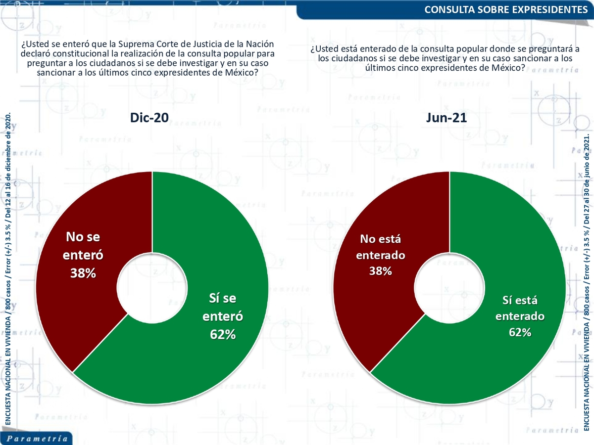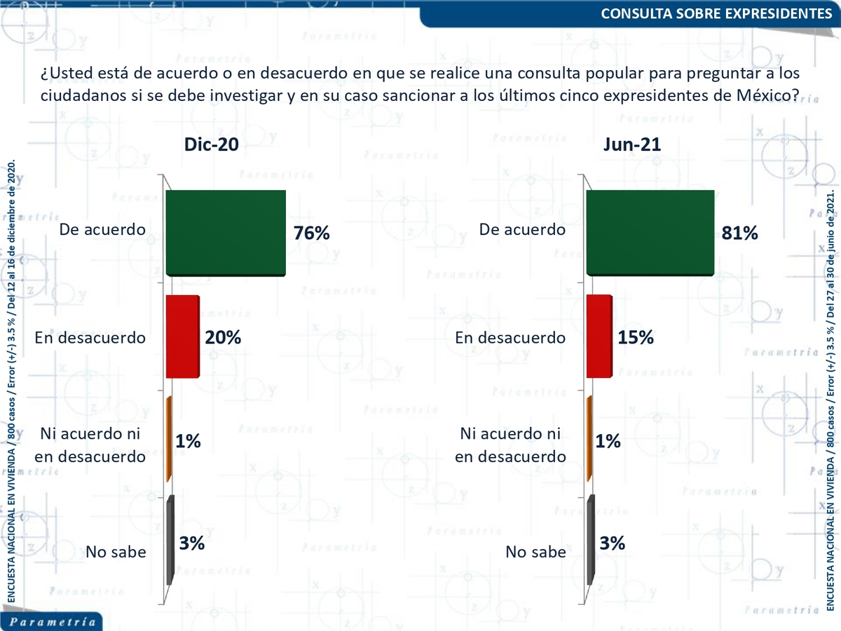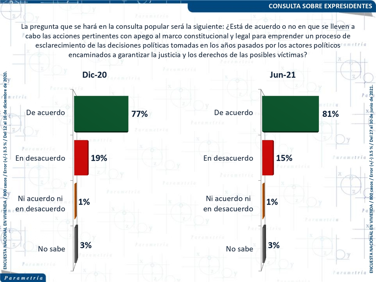 La imagen de los expresidentes explica en buena medida la respuesta del ciudadano a la pregunta de la consulta. Todos ellos tienen una imagen negativa frente a la opinión pública. La más baja de todas es la del expresidente Carlos Salinas de Gortari y la menos negativa es la del expresidente Ernesto Zedillo. Es notable la forma en que ha cambiado la opinión del expresidente Felipe Calderón. Mientras había sido positiva hasta 2018, es evidente cómo empieza a bajar a partir de entonces. Lo que no sabemos es si esta evaluación es consecuencia de los ataques del actual Presidente a sus predecesores o responde a que en general suele haber una visión crítica de toda administración anterior.