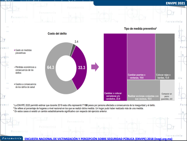 El costo por delito no es un tema menor. A nivel agregado significa 1.85 por ciento del PIB. A nivel individual 7,155 pesos por cada persona afectada. La mayor parte del gasto, dos terceras partes, se debe a la perdida en el evento delictivo mismo. El resto son gastos asociados predominantemente a tener mayor protección en el hogar.