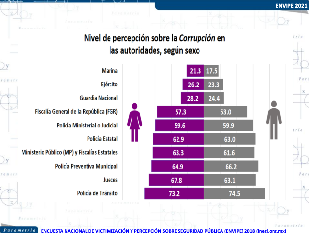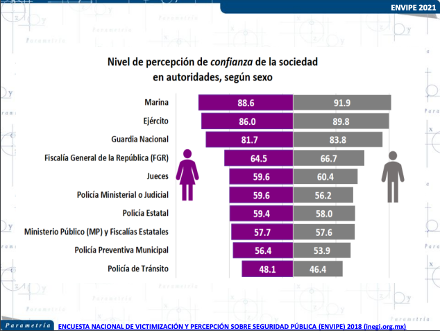 Las instituciones en las que se confía más son las más predecibles de acuerdo a otros indicadores: la marina, el ejercito y la guardia nacional. Resulta revelador que más allá de las instituciones encargadas de nuestra seguridad, las de procuración de justicia estén muy por debajo. La Fiscalía General de la República y los jueces están distantes de las citadas fuerzas del orden público.