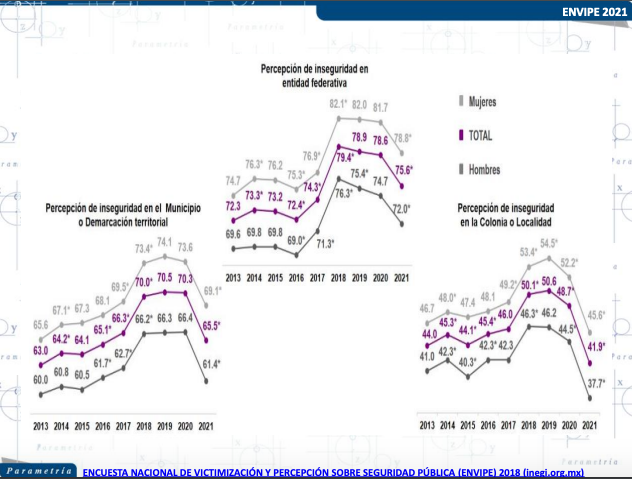 Independientemente de lo que haya pasado en la estimación de delitos factuales es muy revelador lo que sucede en los indicadores de percepción. Estos se miden en tres niveles distintos. La percepción de seguridad a nivel estatal, la percepción de seguridad a nivel municipal y la que se registra a nivel colonia.