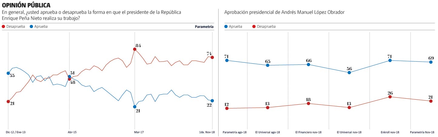 En agosto de este año, 71 por ciento de personas dijeron aprobar el trabajo de López Obrador. Encuestas recientes de El Financiero y El Universal indican que hubo una caída en la misma. El primero reporta que para noviembre la aprobación está en 66 por ciento mientras que el segundo reporta 56 por ciento. En las encuestas hechas por Enkroll y Parametría la aprobación de es de 71 y 69 por ciento, respectivamente. De estos datos, el de El Universal es el que es distinto, pues registra una caída importante; en el resto la aprobación está en alrededor de 70 por ciento.