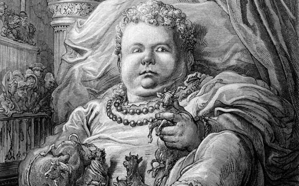 Pantagruel al nacer era tan grande que su madre fallece, y en sus primeros días se bebía: “La leche de cuatro mil seiscientas vacas. Cierto día cogió una, le comió la mitad del vientre, se la quitaron, pero no soltó una pata comiéndosela como vosotros haríais con una salchicha.”