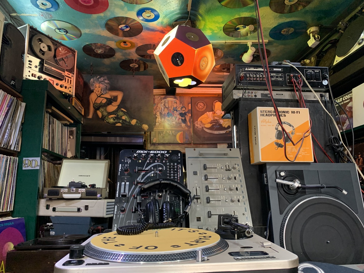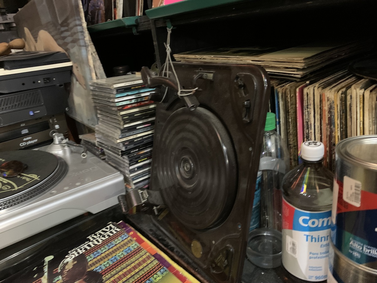 —Todas estas tornamesas, sí, y amplificadores; también mezcladoras; de todo un poquito, le digo. Ya no cabemos aquí.