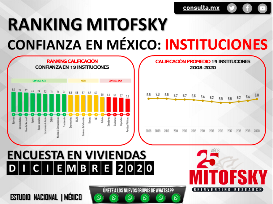 Además de la percepción popular y los decires callejeros, esta afirmación se sustenta en los resultados de múltiples encuestas, entre ellas la publicada por Mitofsky en diciembre de 2020. La consulta se realizó en viviendas (cara a cara), y su objetivo era medir la confianza de la ciudadanía en diecinueve instituciones.