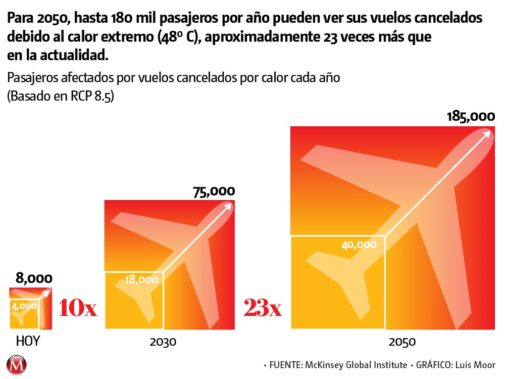 En el transporte, por ejemplo, el calor extremo ya interrumpe viajes aéreos mundiales. En julio de 2017, aproximadamente 50 vuelos fueron suspendidos por razones físicas y reglamentarias cuando las temperaturas en Phoenix, Arizona, se dispararon a 48 grados. Actualmente estos retrasos no se registran, aunque afectan a un estimado de 4 mil a 8 mil viajeros.