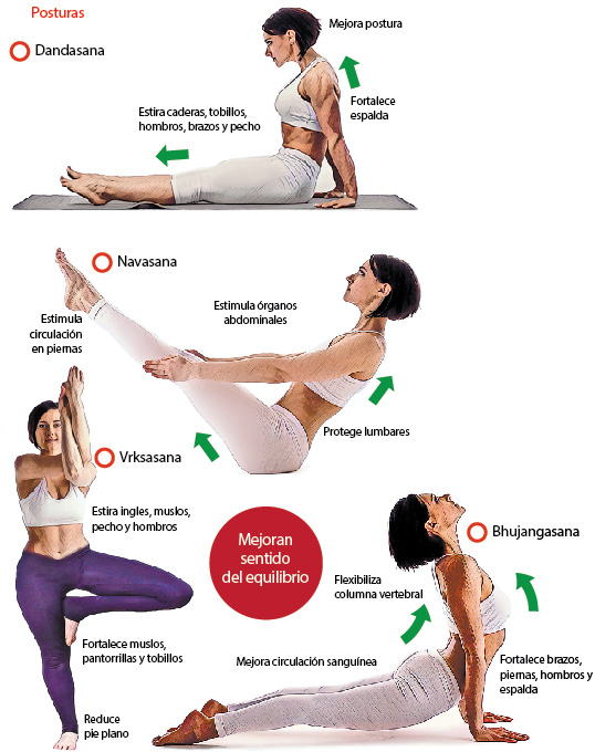 1.Bhujangasana, la postura de la Cobra. Según explica Swami Prabodhananda Saraswati, la postura de la Cobra es esencial para desarrollar la fuerza y la flexibilidad de toda la espalda, mientras tonifica las piernas y los glúteos, aumenta la circulación y ayuda en la función renal.