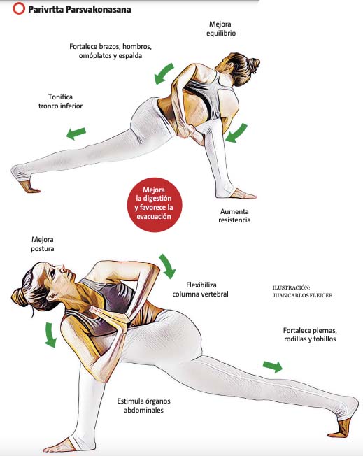 Un ejemplo de una postura donde se realiza un estiramiento muy profundo es Parivrtta Parsvakonasana, una variante de Utthita Parsvakonasana, la Postura del Ángulo Lateral Extendido, donde no solo se extiende un lado del cuerpo, sino los dos y donde agregándole un giro se relaja la columna y se estimulan los órganos internos, ayudando a desintoxicar el cuerpo y la mente. Además, esta Asana ayuda a tonificar las piernas y glúteos, así como a incrementar la energía.