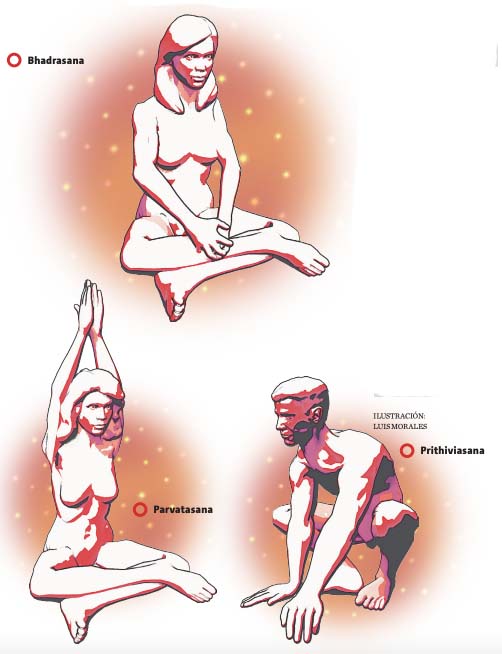 -Prithiviasana, la postura de la Diosa de la Tierra. Inhalando, yergue el tronco y lleva las plantas de los pies y las palmas de las manos a la tierra, abriendo las rodillas. Observa el ascenso de la energía entrando por manos y pies.