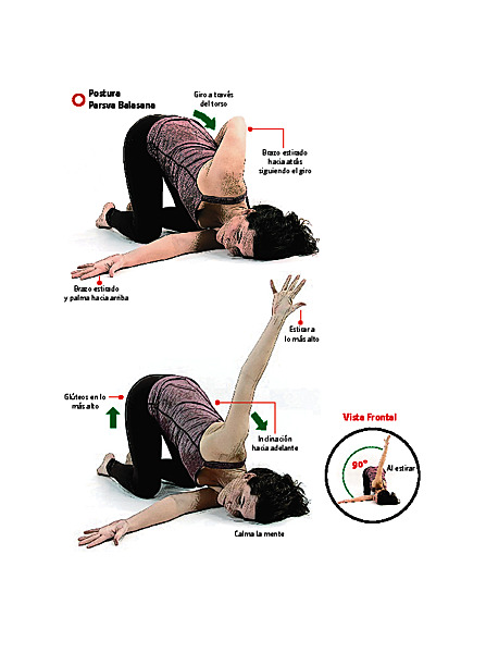 Como explica el portal lahamacadelona.com, ésta es una asana suave que incorpora un giro del torso mientras el cuerpo y la mente experimentan los beneficios calmantes de una flexión hacia adelante. Parsva Balasana es la postura ideal para cualquiera que padezca de estrés crónico, especialmente para aquellos que concentran la tensión en la parte superior del cuerpo, en cuello y hombros: “Se piensa que la torsión de la columna ayuda a “exprimir” la energía negativa, liberando la tensión física y mental y preparándola para una nueva nutrición”.