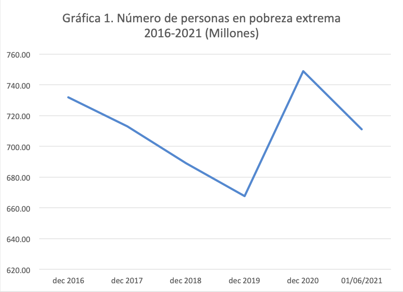 Desafortunadamente el covid ha sido un latigazo que ha colocado nuevamente a muchas personas en situación de pobreza extrema. En el mundo, los esfuerzos de combate a la pobreza venían reduciéndola a un promedio del 3 por ciento anual, pero el covid generó que 80 millones de personas regresaran a pobreza extrema, a niveles similares de hace cuatro años (gráfica 1).