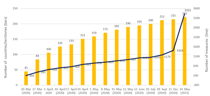 Para contrarrestar los efectos del covid los programas sociales se han incrementado fuertemente en todos los países. Durante el covid los países con programas de mitigación de pobreza han pasado de 45 a 232 y las medidas implementadas han pasado de 500 a 3,300 (gráfica 2).