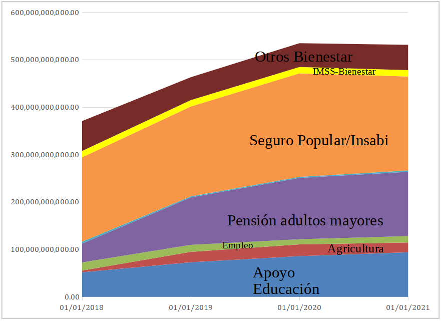 Le sigue en importancia el programa de pensiones para adultos mayores, que ocupa un 25 % del gasto social, habiendo crecido en un 240% con respecto del presupuesto del 2018. El programa de becas para la educación constituye un rubro también muy importante, con el 18 % del gasto total analizado, habiendo crecido presupuestalmente en un 81%. El programa de apoyo al empleo, aunque tan solo representa el 3% del gasto total, creció un 400% al introducirse el programa de jóvenes construyendo el futuro que subsidia la nómina de aquellos trabajadores que puedan incorporarse al empleo formal.