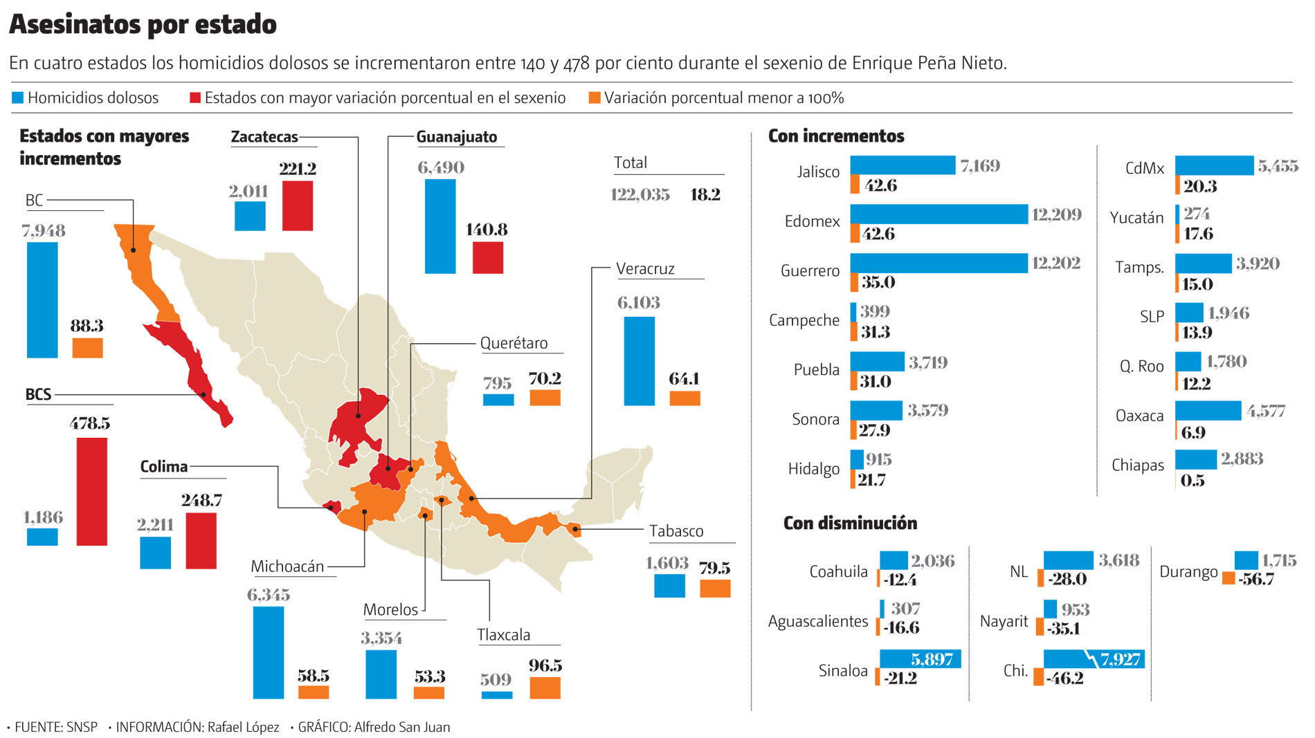 Los estados con una diferencia mayor en números absolutos en los homicidios dolosos entre un sexenio y otro fueron Guanajuato, donde se rebasó el registro del sexenio anterior por 3 mil 795 asesinatos más; Baja California, con 3 mil 726 homicidios adicionales; Estado de México con 3 mil 645 delitos de incremento y Guerrero con 3 mil 165 muertes violentas más con respecto al sexenio pasado.