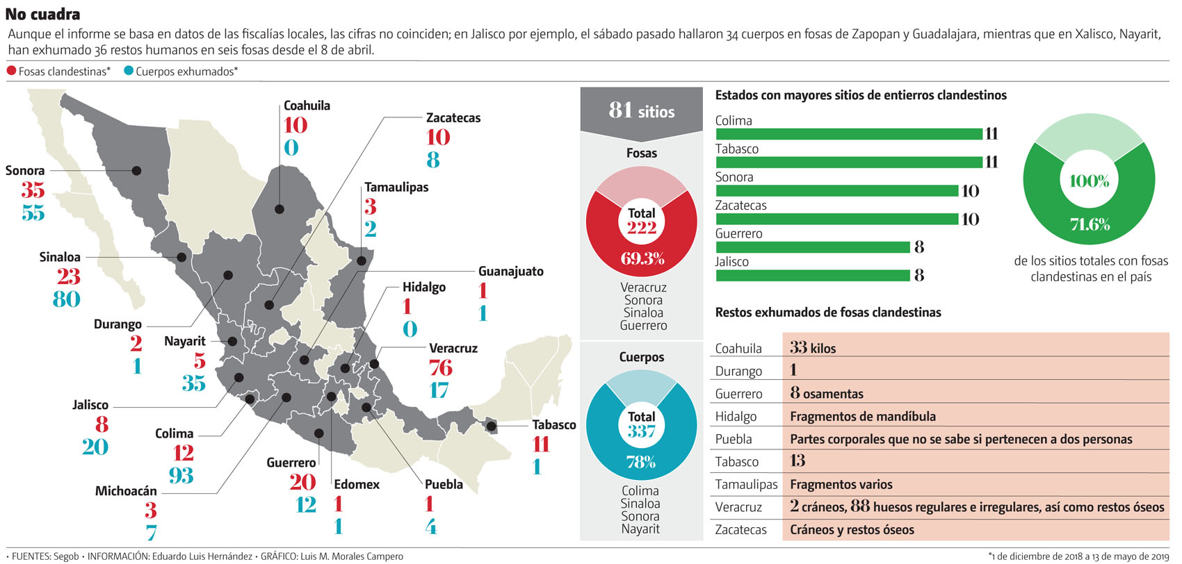 Del 1 de diciembre de 2018 al 13 de mayo pasado fueron localizados en todo el país 81 sitios con 222 fosas clandestinas y 337 cuerpos, informó Alejandro Encinas, subsecretario de Derechos Humanos, Migración y Población de la Secretaría de Gobernación.