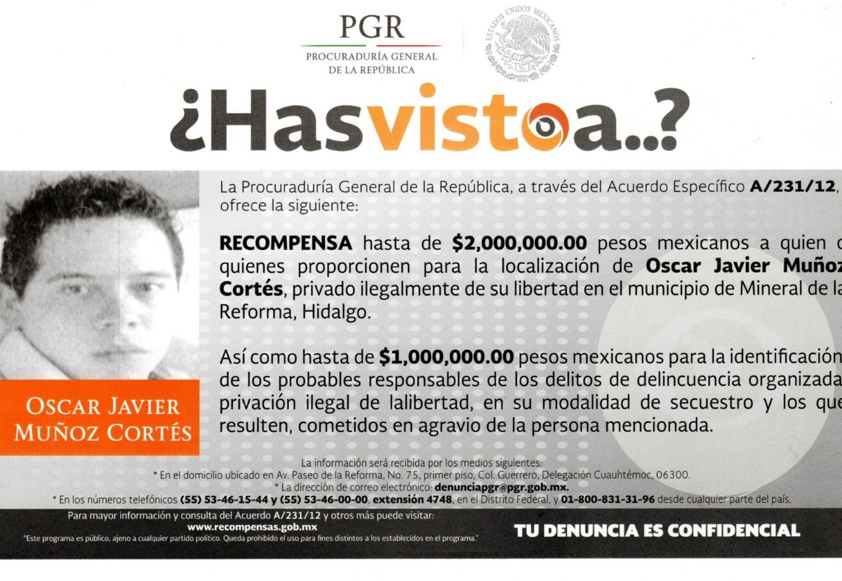 María Candelaria Cortés Molina, madre de Oscar Javier Muñoz Cortés, joven de 21 años estudiante de gastronomía en la Universidad Científica Latino Americana de Hidalgo (UCLAH), asegura que su hijo fue víctima de una desaparición forzada. Un policía lo entregó a un grupo de sujetos armados y pese a la incesante búsqueda que ella y su esposo Oscar Javier Muñoz Aguilar han encabezado tanto en la entidad como en otros estados del país, nada se sabe de su paradero desde aquel noviembre de 2008.