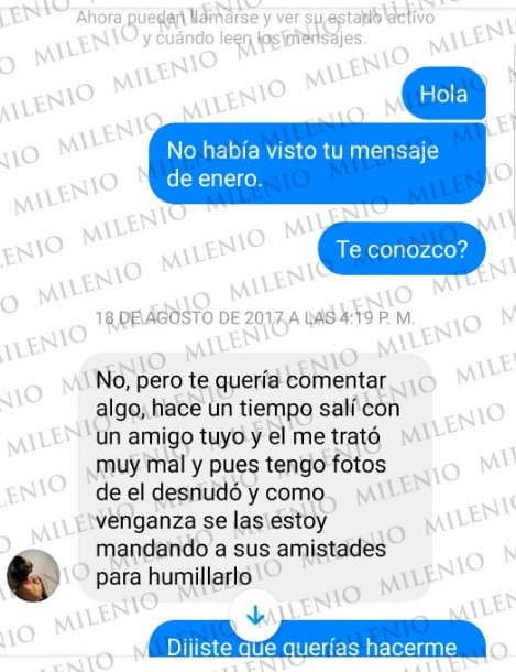 “Él me contactó con un perfil falso, bajo el nombre de Mabel Leiva diciéndome que ella (se hacía pasar por mujer) había andado con uno de mis amigos de Facebook y que estaba compartiendo unas fotos para vengarse de él", relató a MILENIO. Posteriormente, le mandó una foto de un hombre desnudo, en la que no se ve su cara.
