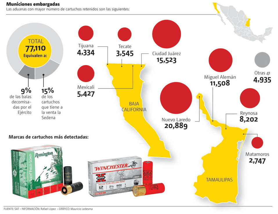 Una revisión a la base de datos de objetos embargados del Servicio de Administración Tributaria (SAT), entregada vía Transparencia a MILENIO, revela que los delincuentes siguen empeñados en cruzar las armas a través de los pasos fronterizos formales y que aquellos que registran una mayor retención de balas son los de Nuevo Laredo, Tamaulipas, con 20 mil 889 cartuchos, y Ciudad Juárez, Chihuahua, con 15 mil 523 unidades. Entre estas dos aduanas se embargó 47 por ciento de los cartuchos en el país.