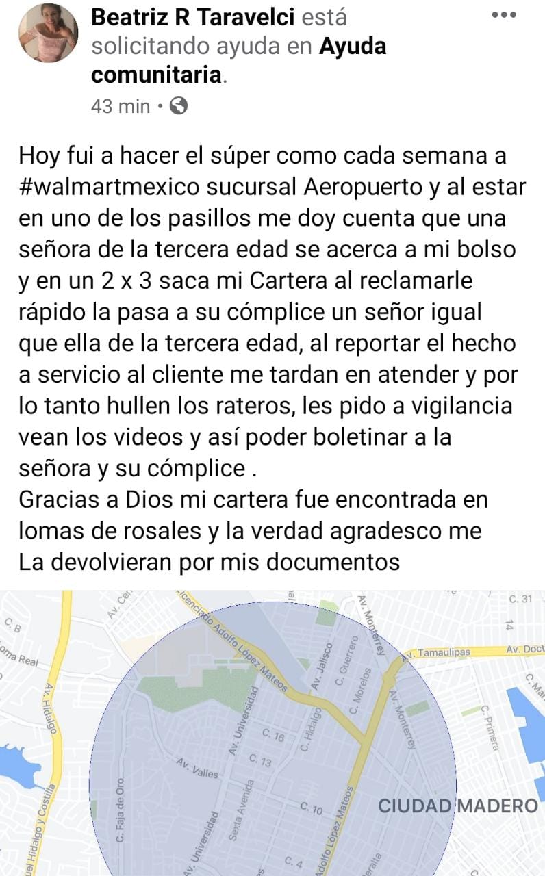 La regidora electa de Tampico, Beatriz Taravelci, dio a conocer a través de sus redes sociales que al acudir al hacer sus compras y encontrarse en uno de los pasillos una señora de la tercera edad se le acercó a su bolso y rápidamente sustrajo la cartera, al percatarse de lo anterior le reclamó y esta a su vez le pasó sus pertenencias a otro señor también adulto mayor.