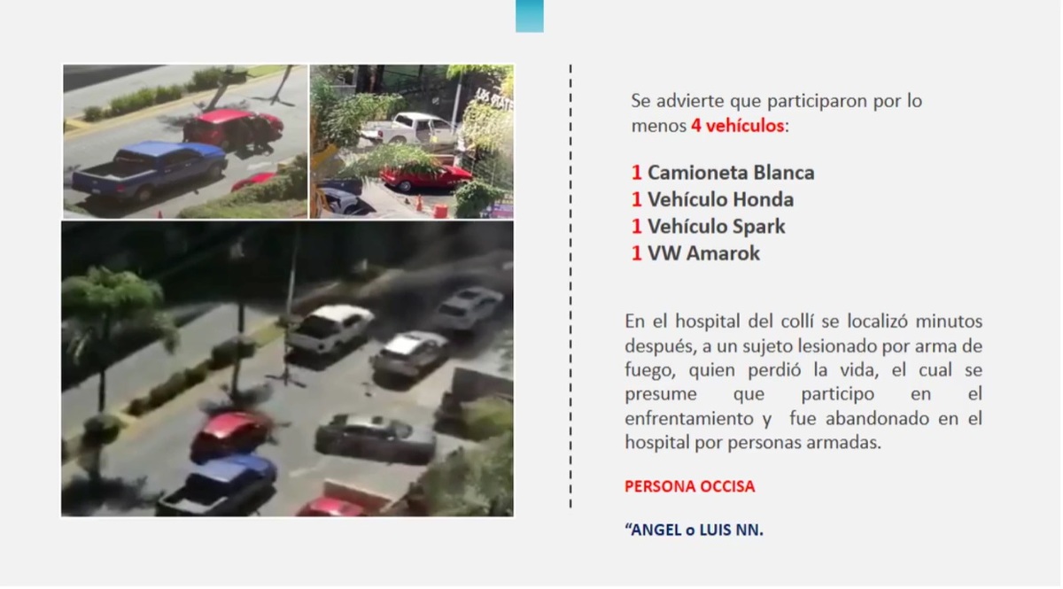 Durante la conferencia de prensa, el fiscal del estado presentó videos recopilados sobre el enfrentamiento, en los que se observa que uno de los agresores cae al piso herido, por lo que sus acompañantes lo levantan, lo suben a una camioneta y huyen del lugar.