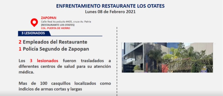 Alrededor del mediodía, narró, un comandante de la Policía de Zapopan escuchó gritos del interior del restaurante, por lo que se acercó y vio a hombres que portaban chalecos tácticos y que estaban armados, por lo que les disparó e inició el enfrentamiento.